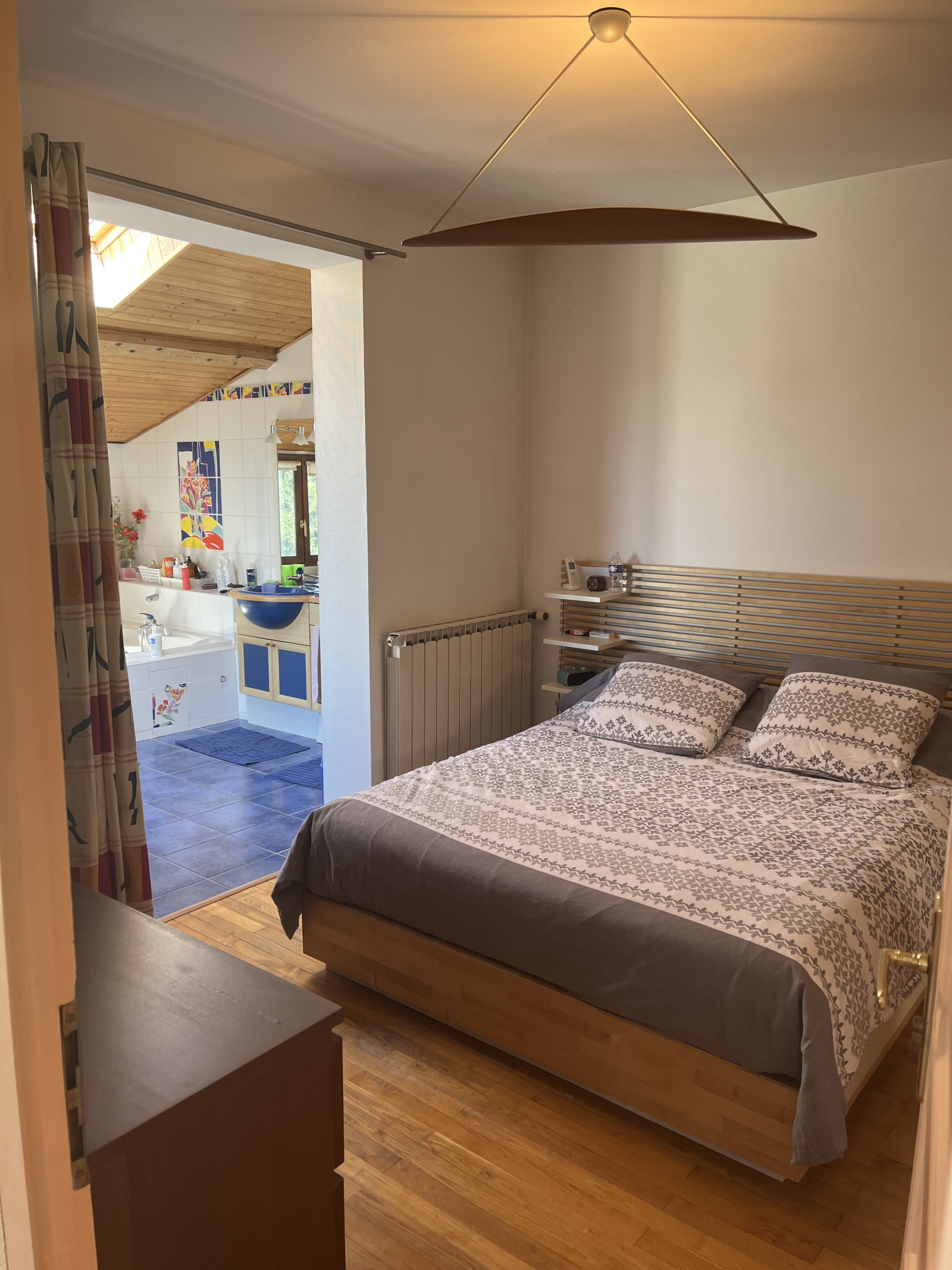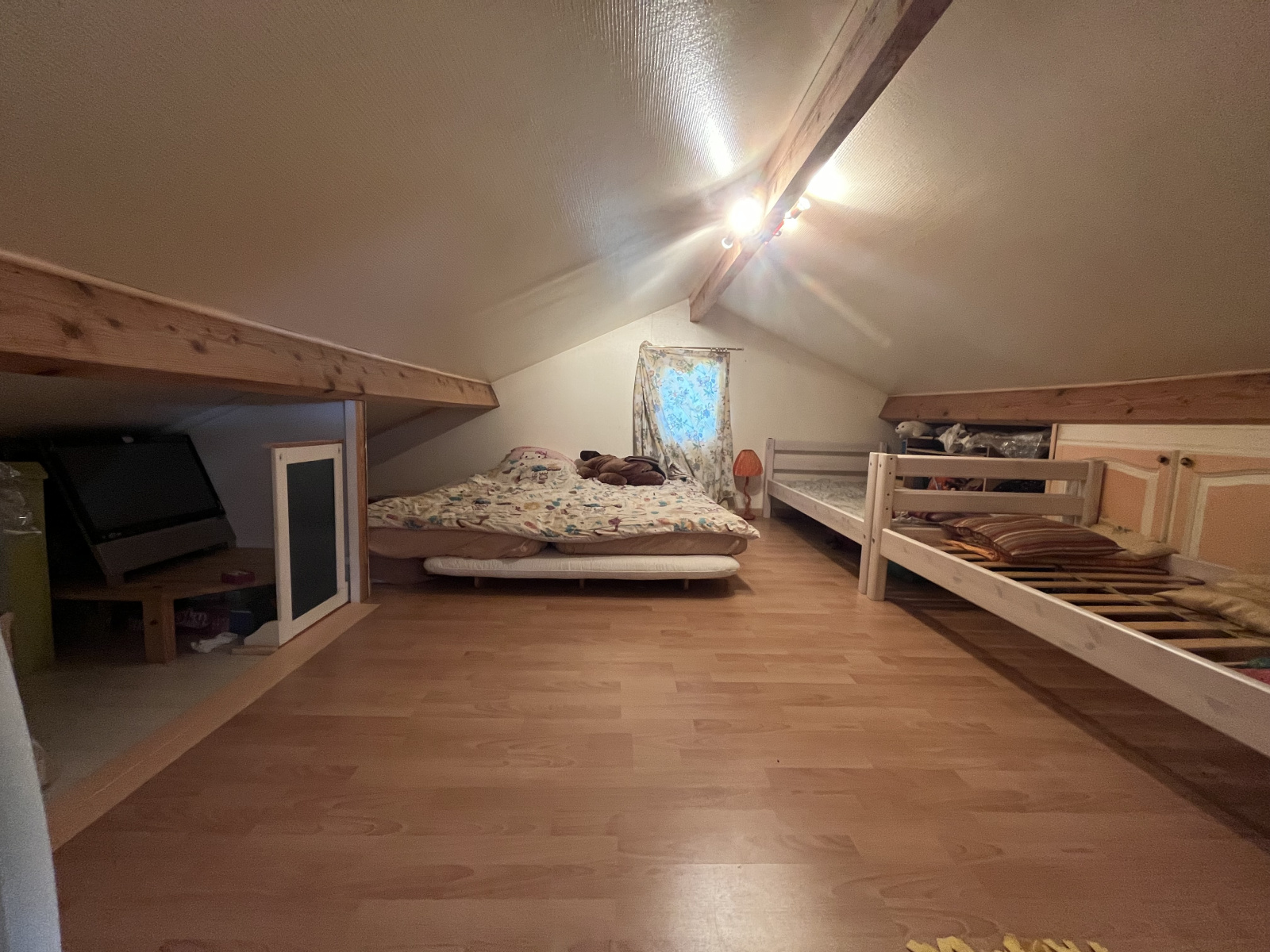 A l’étage supérieur, de nombreux rangements et une grande pièce aménagée en chambre ou salle de jeux, remplissent parfaitement cet espace utile d’environ 35m2 aménagé dans les combles.